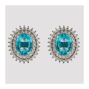 Pendientes en oro blanco con zafiro azul talla oval orlado por ondas de pavé de diamantes talla brillante.