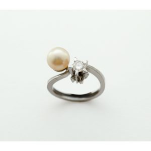 Sortija tu y yo en oro blanco con perla cultivada de 7,5 mm. y diamante talla brillante engastado en garras.