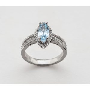 Sortija en oro blanco con topacio azul talla marquise de 10 x 5 mm. orlado y custodiado por bandas de diamantes talla brillante.