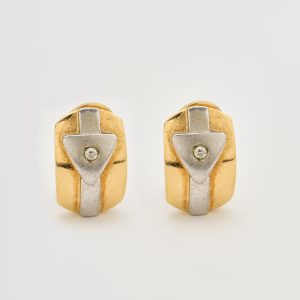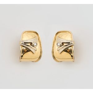 Pendientes diseño media criolla en oro bicolor con circonita engastada en chatón.