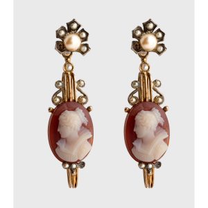 Pendientes largos estilo victoriano en oro y vistas en plata con perlas de aljofar y camafeo en concha representando perfil de dama, 4,8 cm.