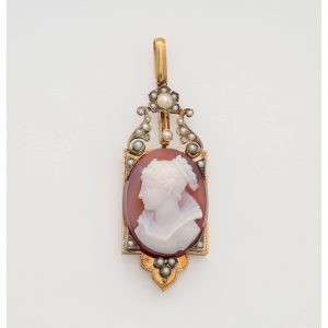 Colgante estilo victoriano en oro y vistas en plata con perlas de aljofar y camafeo en concha representando perfil de dama, 7 x 2,5 cm.
