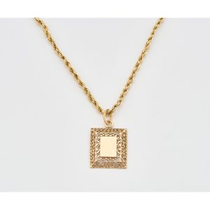 Cadena cordón y placa con marco de filigrana en oro, 2,3 x 1,6 cm.