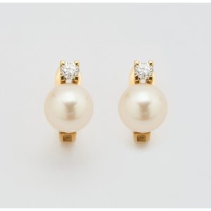 Pendientes tu y yo en oro con perla cultivada de 9,5 mm. y diamante talla brillante engastado en garras.