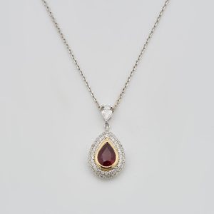 Gargantilla en oro bicolor con rubí (Burma) y diamante talla perilla. El rubí orlado por pavé de diamantes talla brillante.