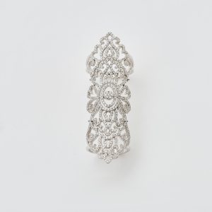 Sortija lanzadera articulada calada en oro blanco con diamantes talla brillante, 6 cm.