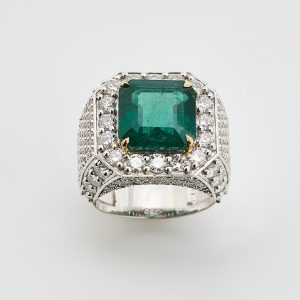 Sortija diseño sello en oro bicolor con esmeralda central talla octogonal y cuerpo cuajado de diamantes talla brillante.
