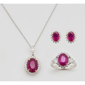 Juego de pendientes, sortija y gargantilla diseño rosetón con rubí de Myanmar ( Burma ) talla oval orlado por diamantes talla brillante y un diamante talla marquise en la gargantilla.