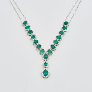 Gargantilla en oro blanco con rosetones de esmeraldas colombianas tallas oval y perilla orladas por diamantes talla brillante.