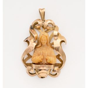 Medalla capilla en oro con representaciòn de Virgen en resina, 3,5 x 2,2 cm.