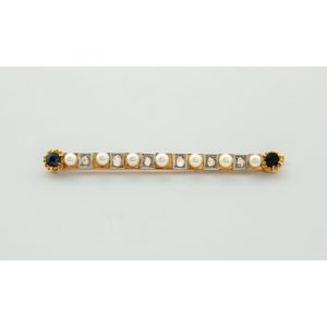 Aguja en oro y vistas en platino con diamantes talla rosa 3/3, perlas cultivadas de 4 mm. y dos ónix de 4 mm. engastados en garras, c.1940, 7 cm.