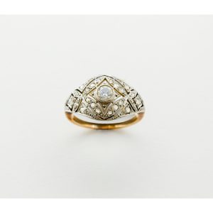 Sortija Art Deco en oro y vistas en platino con calado de diamantes tallas brillante antigua y rosa holandesa, c.1930.