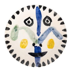 Plato en loza blanca esmaltada al fuego en negro, azul, amarillo y verde. Numerado 108/500 y justificado «Edición Picasso Madoura». Marcas en la base.