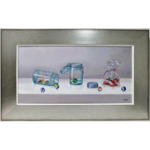 Bodegón de fresas y canicas.