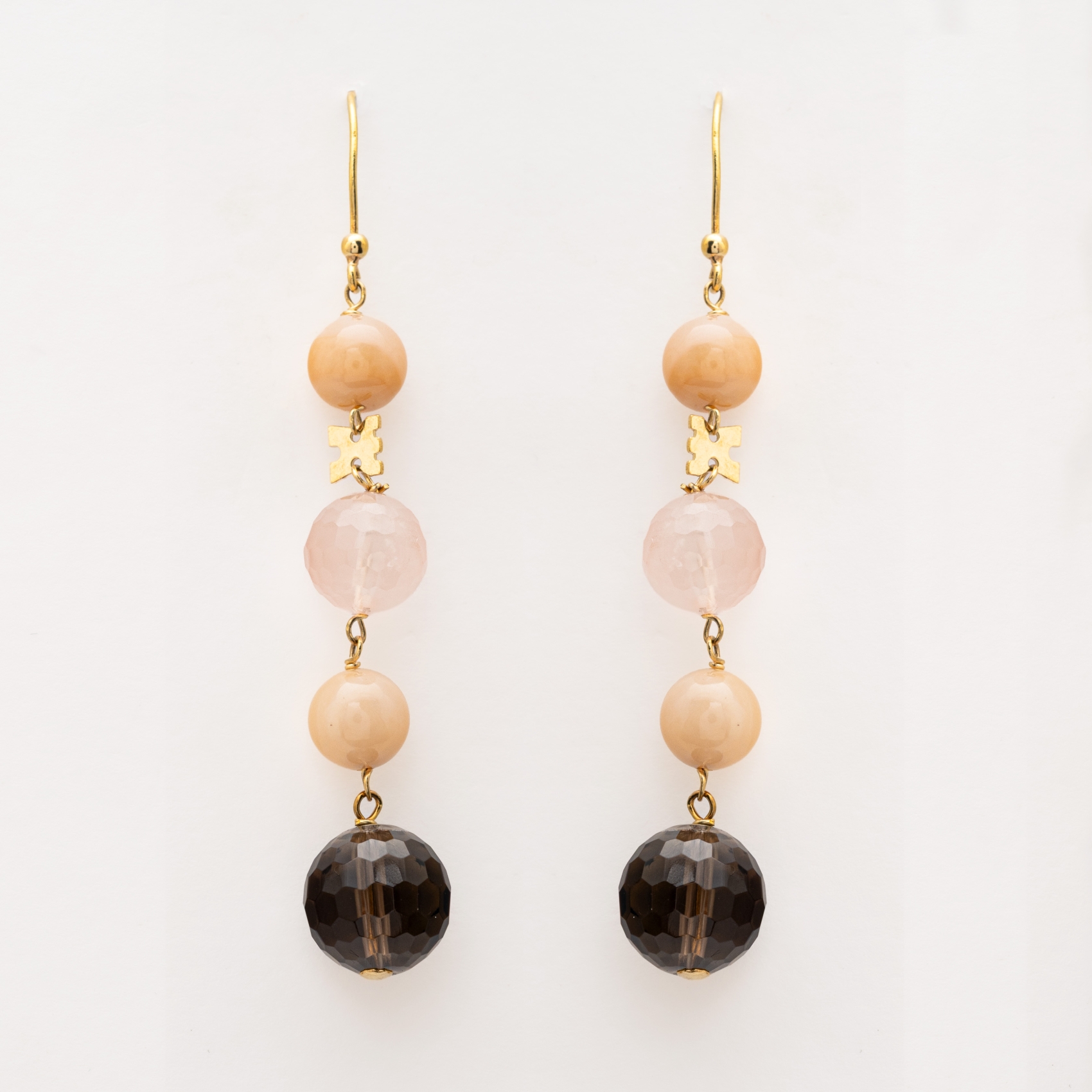 Pendientes largos en oro con cuentas circulares en cuarzo rosa de 8 – 10 mm y cuarzo fumé de 10 mm.