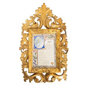 Presenta un monograma central coronado por una corona real y rodeado por laureles.
