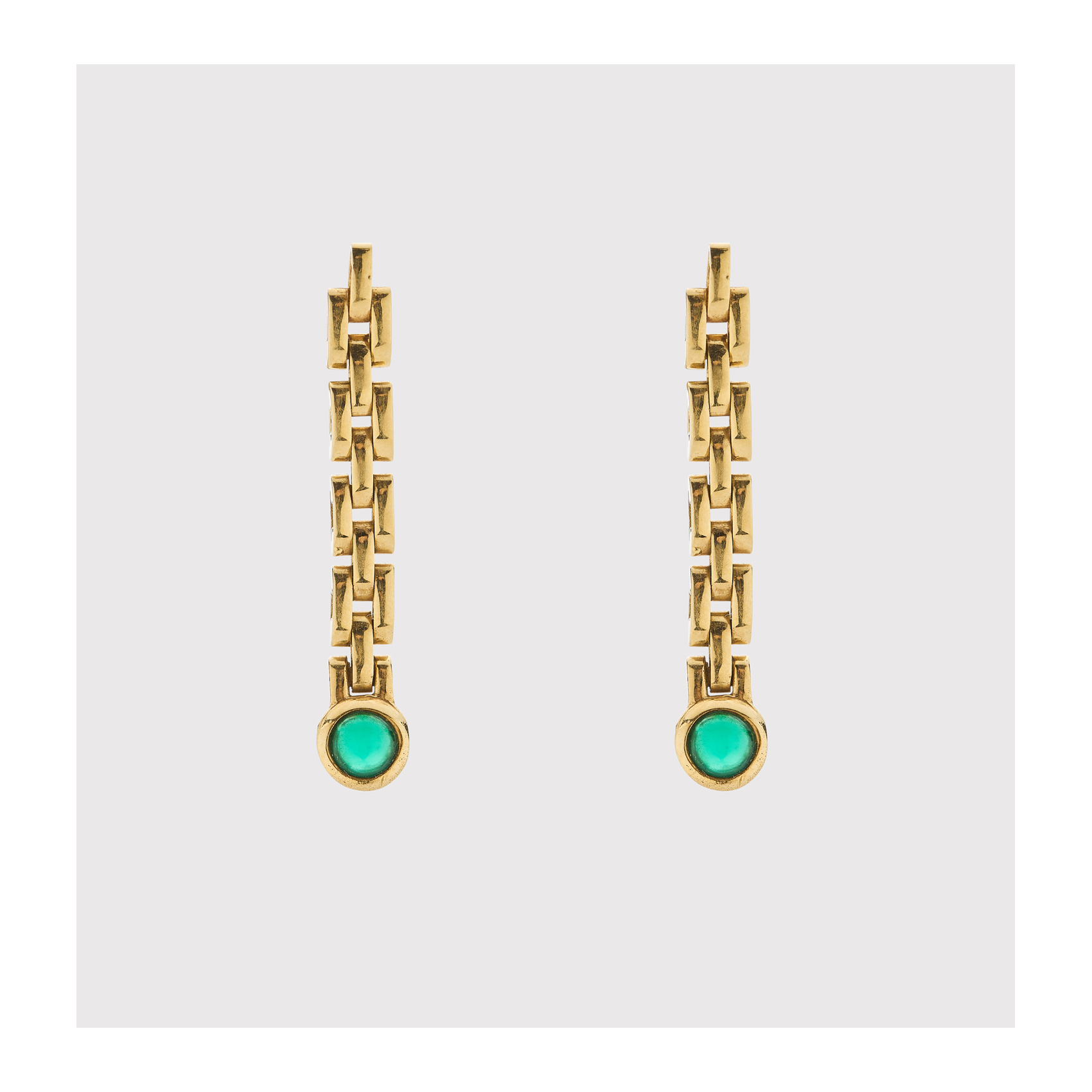 Pendientes largos articulados en oro con cabujón circular de crisoprasa de 4 mm engastado en chatón.