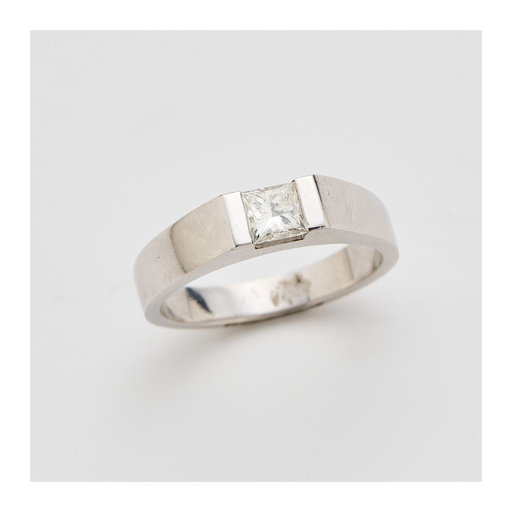 Sortija en oro blanco con diamante talla princesa engastado en carril.