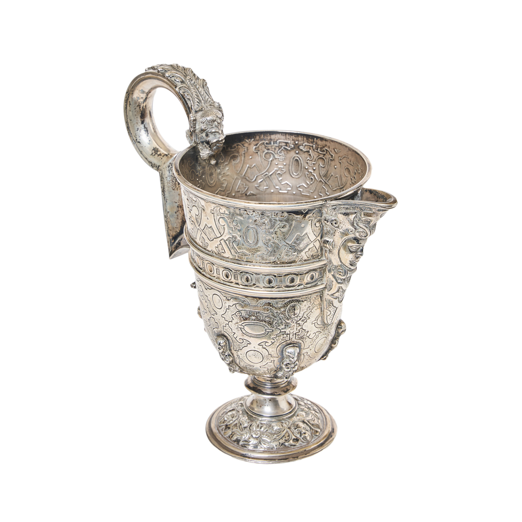 Jarra de pico en plata española punzonada 916, siguiendo modelos del s.XVII. Decorado con costillas, tornapuntas y mascarón. Marcada, s.XX.
