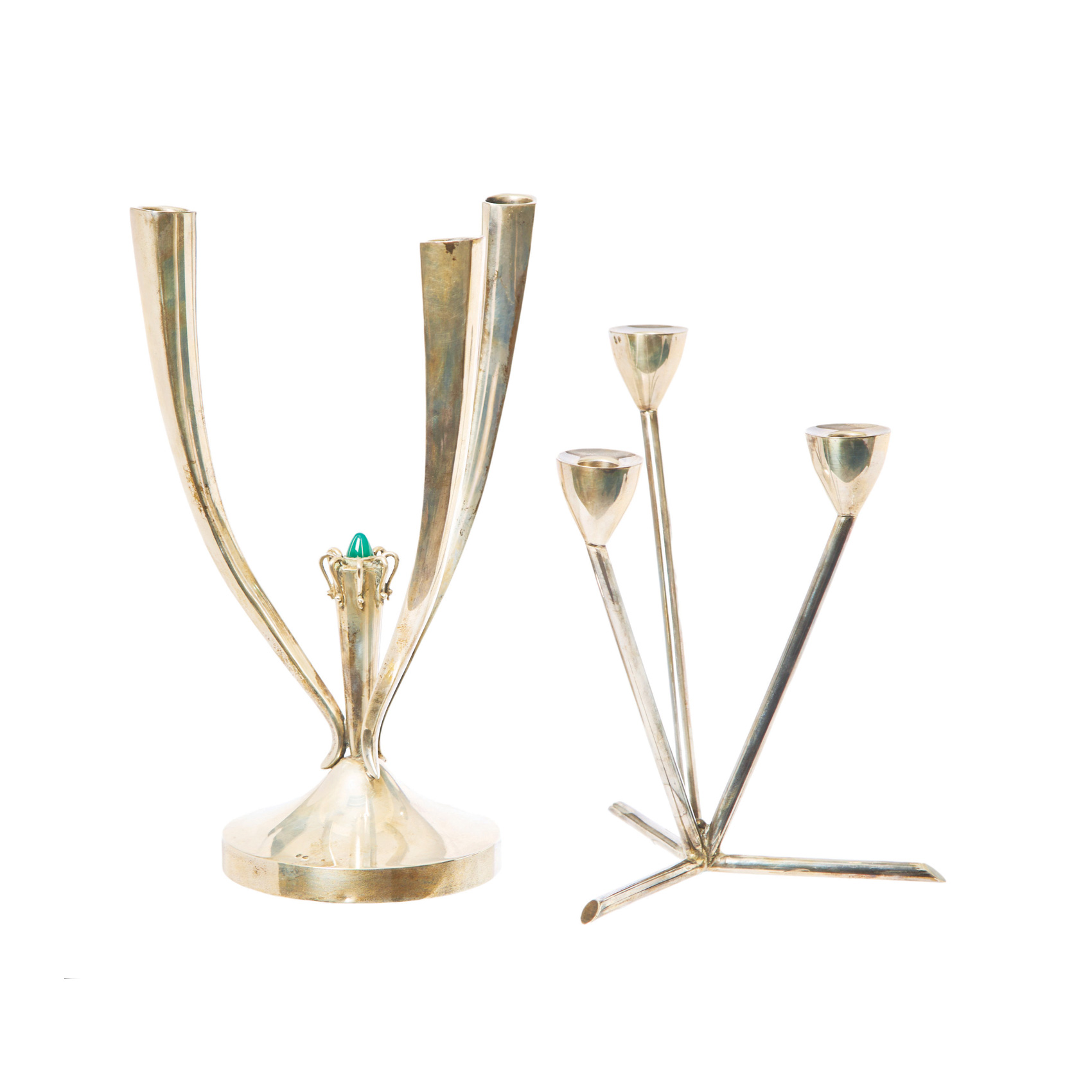 Lote de dos candelabros en plata española punzonada con decoración de líneas lisas y pequeño cabujón incrustado en piedra dura, s.XX.