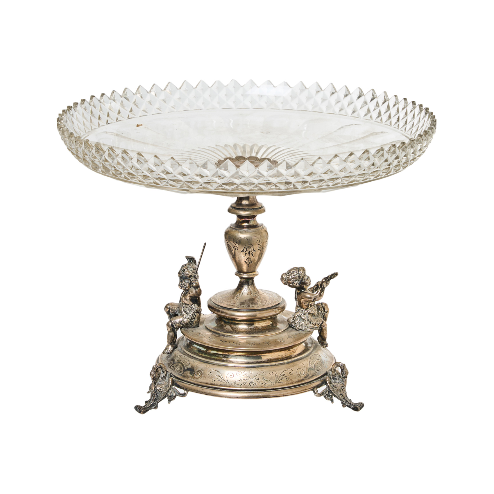 Centro en cristal tallado y facetado con pie y base en plata punzonada con decoración de infantes y motivos vegetales cincelados, fles. del s.XIX.