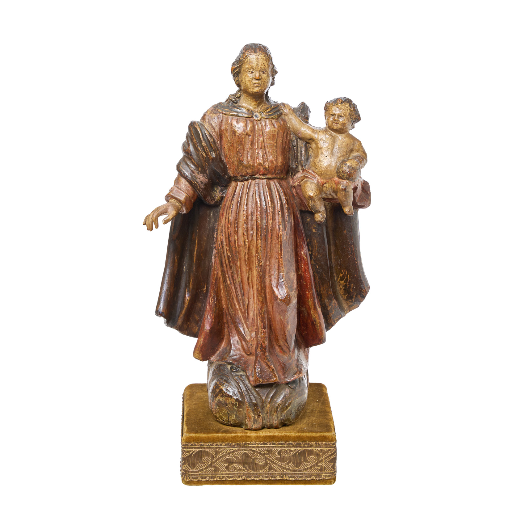Escultura en madera tallada y policromada sobre peana en terciopelo verde.