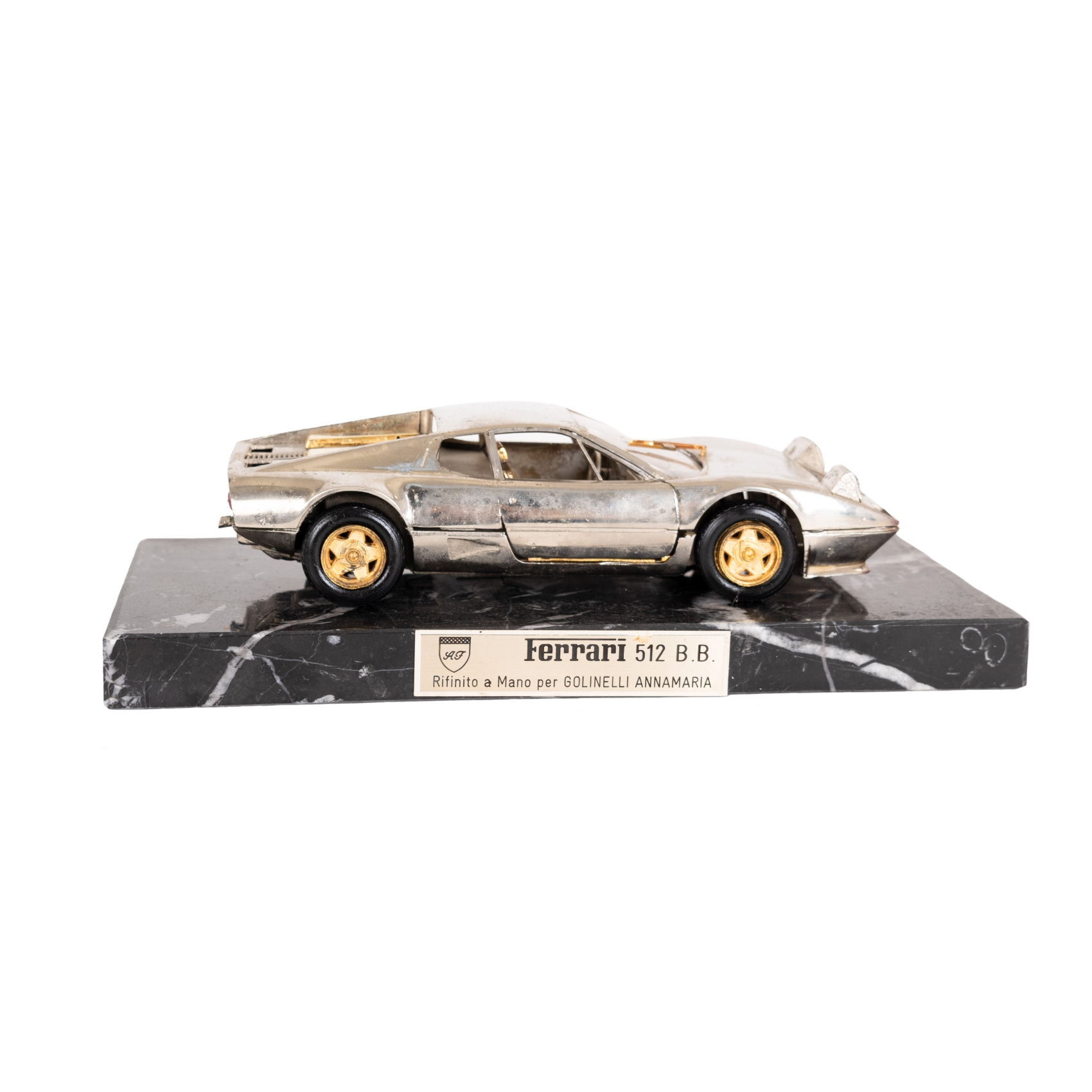 Ferrari 512 BB. Miniatura en plata 800 hecho a mano por Golinelli Annamaria sobre peana en mármol negro veteado. Custodiado en estuche original. Adjunta certificado de garantía.