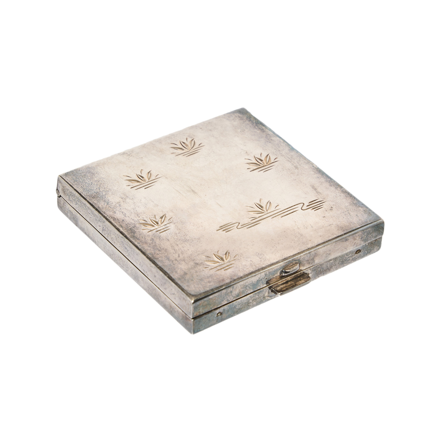 Tiffany & Co. Cajita polvera en plata punzonada con decoración cincelada de flores de loto, c.1930-1940. Interior con pequeño espejo.