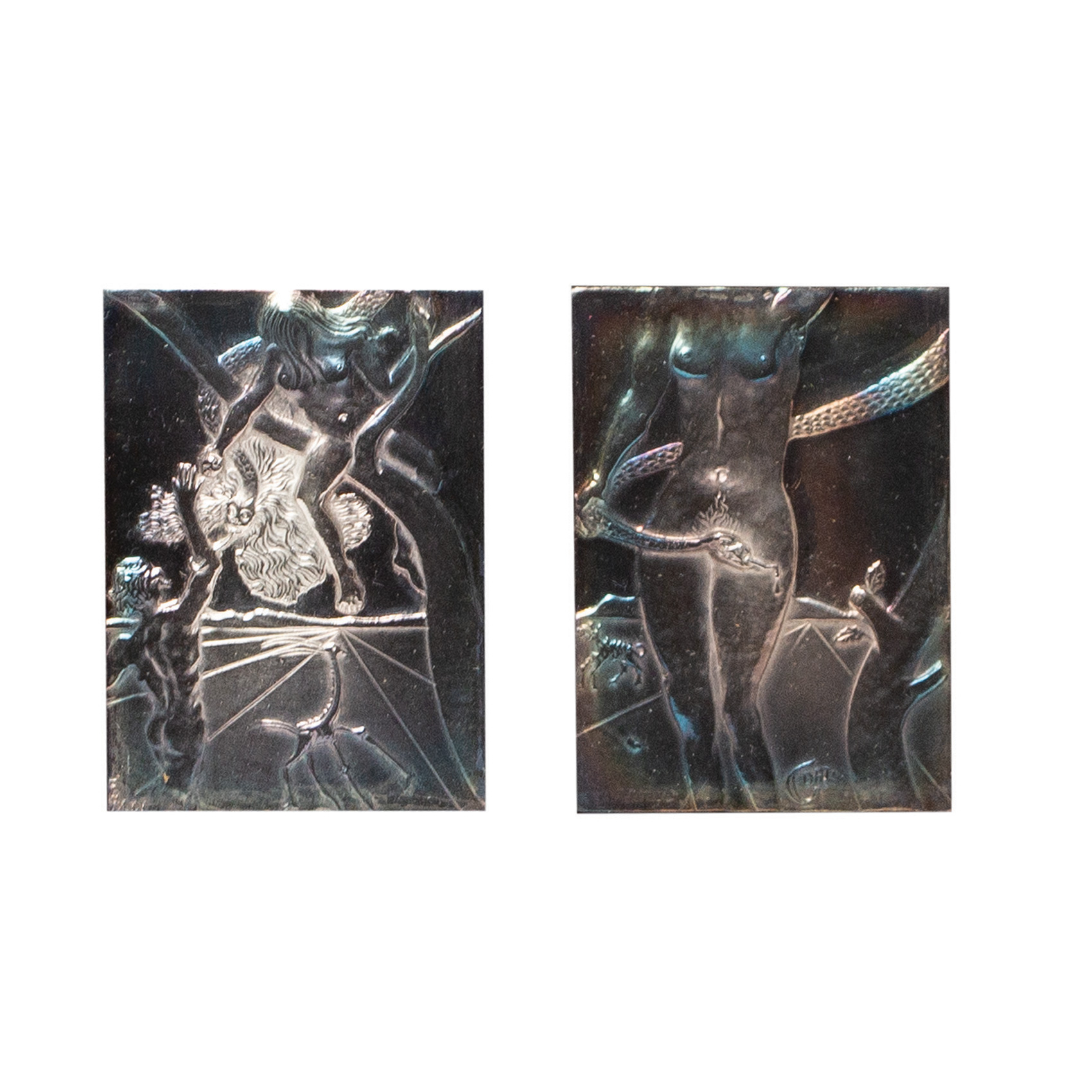 Pareja de placas en plata con representación de Eva con la serpiente y Adán y Eva en bajorrelieve. Firmadas. Enmarcadas.