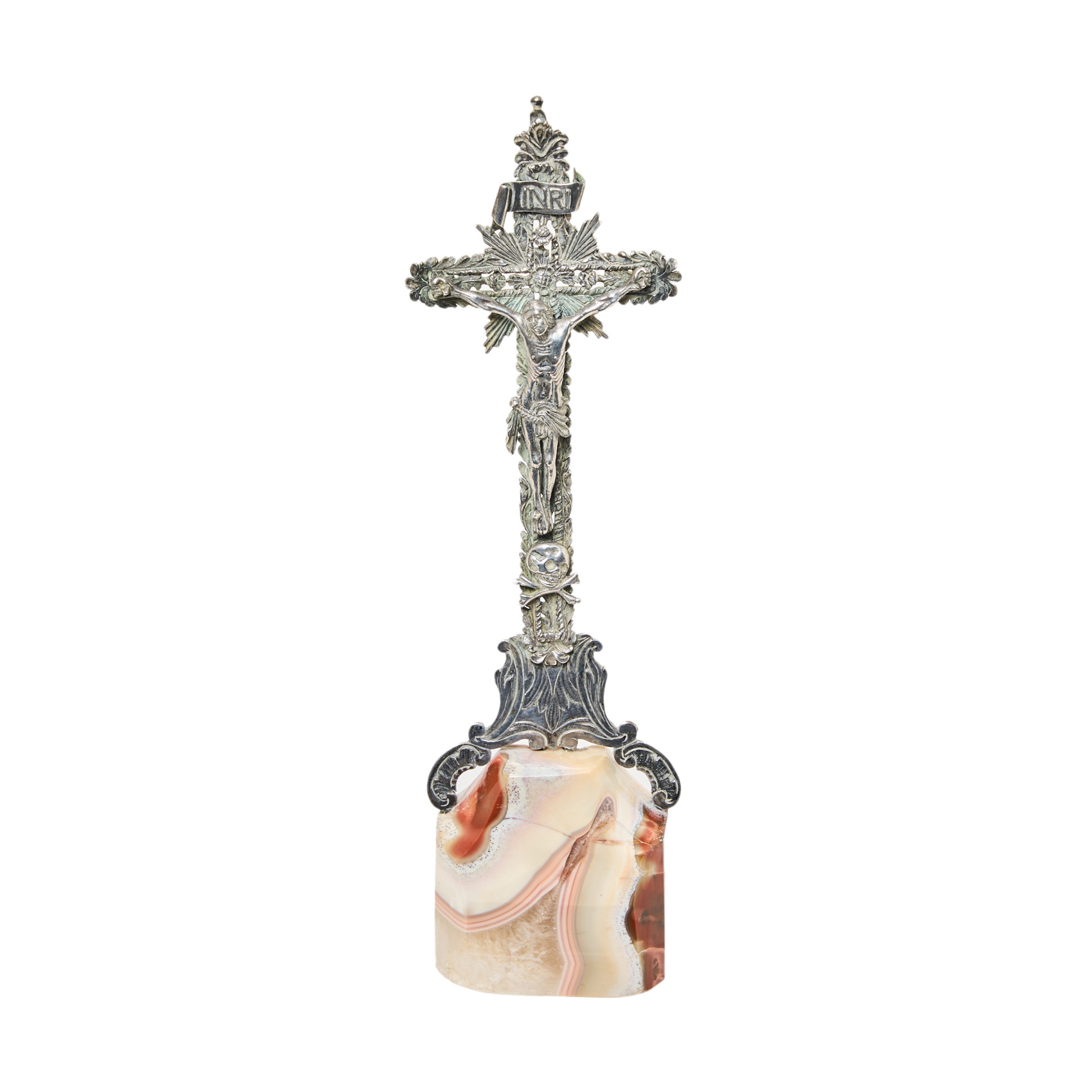 Crucifixión en plata calada y labrada sobre peana en ónix, fles. del s.XIX.