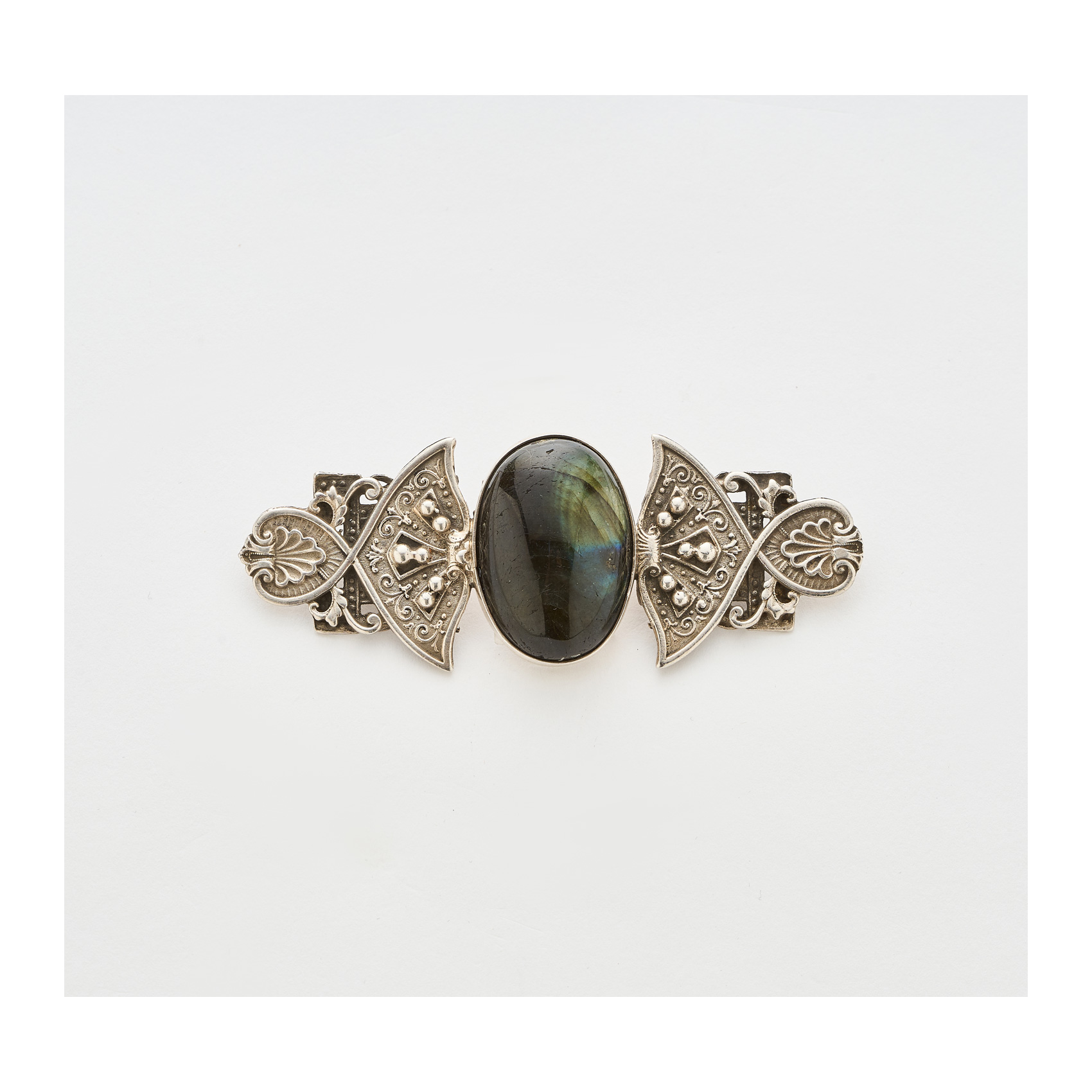 Broche en plata con cabujón central de labradorita de 28 x 19 mm. custodiado por motivos labrados, roleos y bolitas, 8 cm. Estimación:190 – 240€