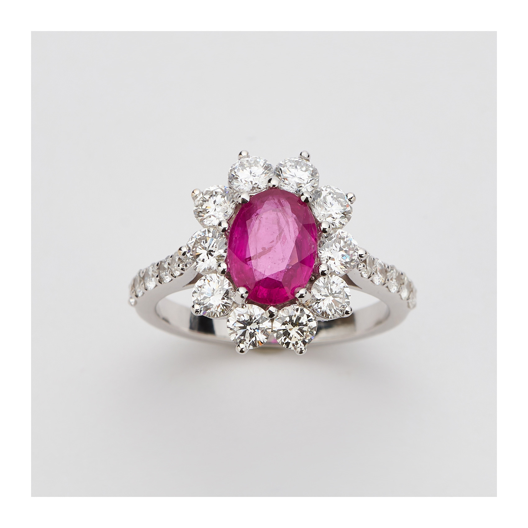 Sortija rosetón en oro blanco y un rubí de Myanmar (Burma) talla oval con orla y brazos de diamantes en talla brillante.