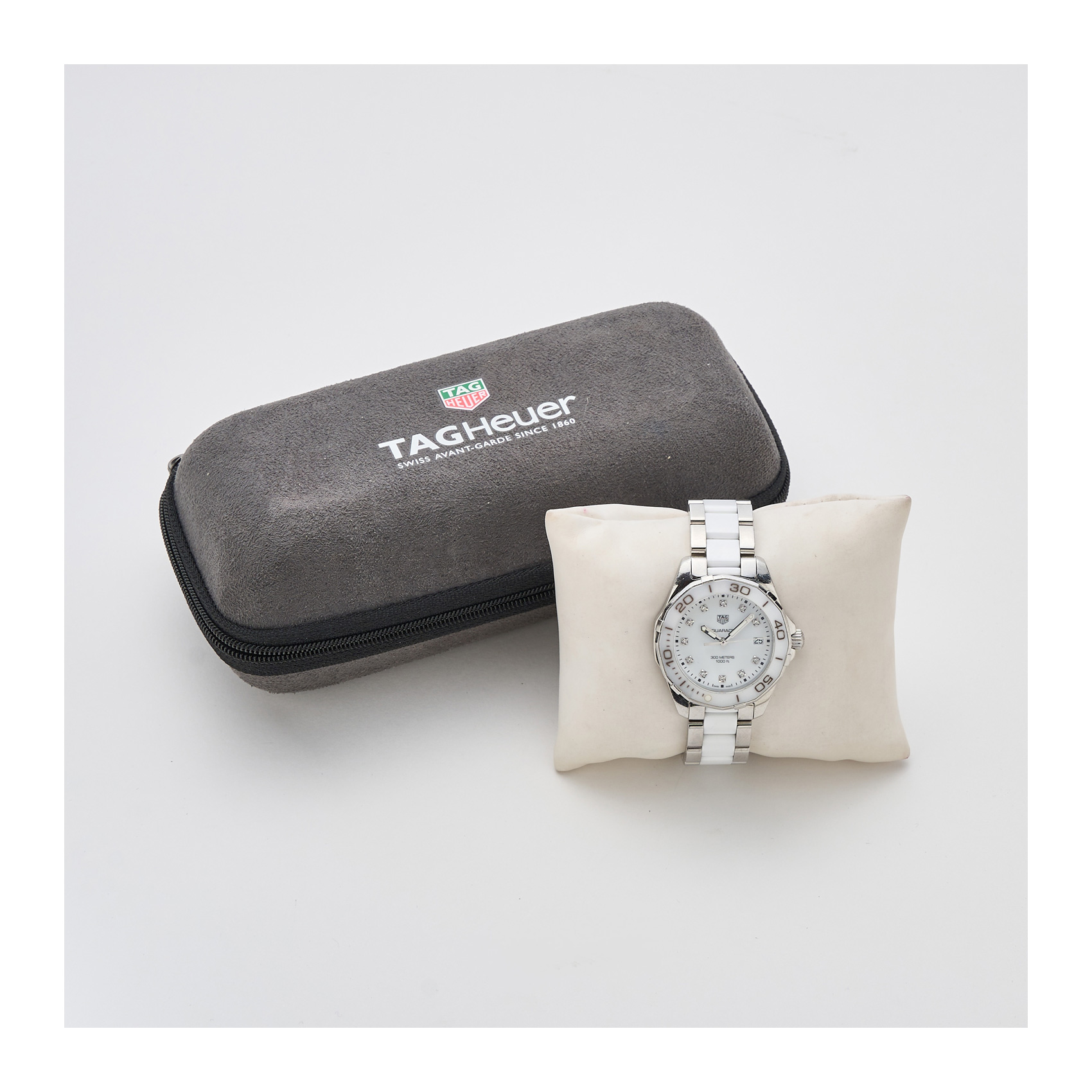 TAG HEUER «Aquaracer». Reloj de pulsera unisex. En acero y porcelana blanca. Esfera con diamantes talla brillante en la numeración. Mecanismo de quartz.