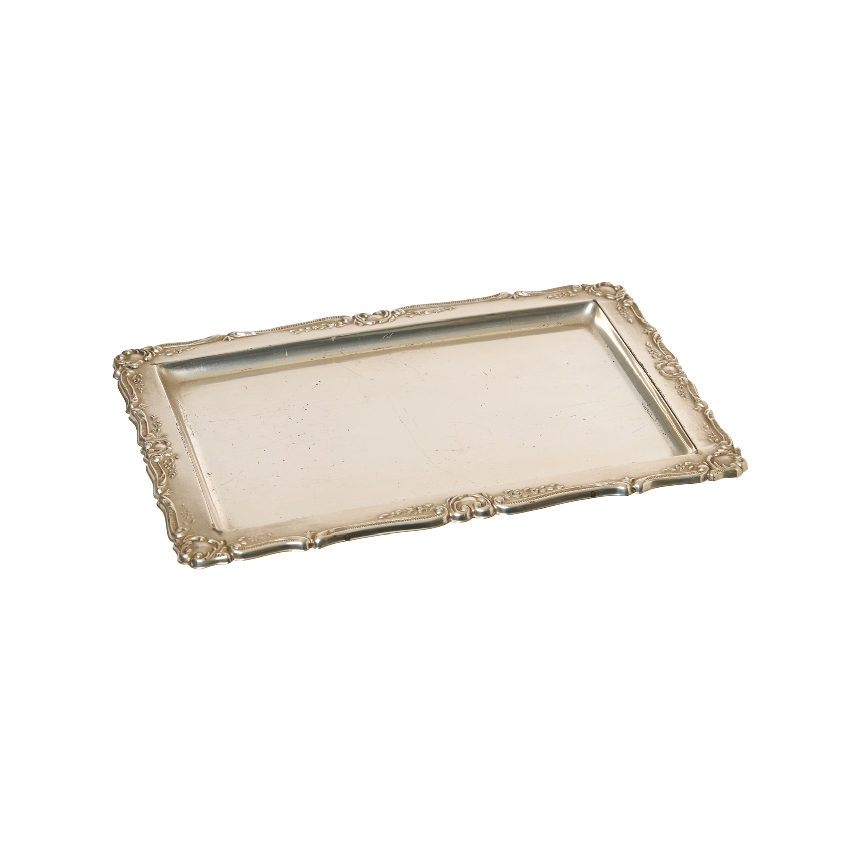 Bandeja en plata española punzonada con decoración de motivos florales y roleos en el perfil, s.XX.
