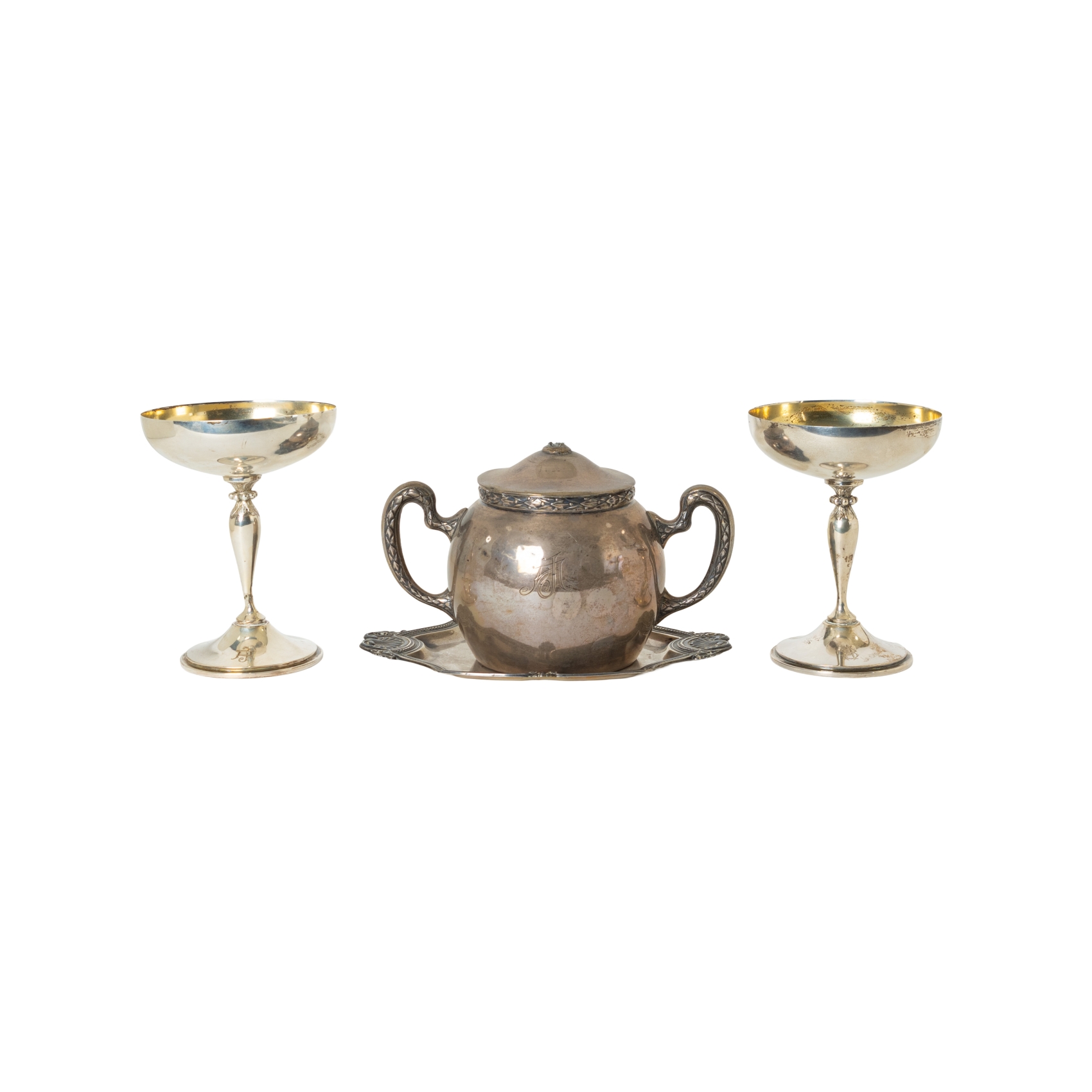 Lote de cuatro piezas variadas en plata española punzonada con contrastes de Barcelona, ppios. del s.XX. Compuesto por dos copas de champagne, una azucarera y una bandejita.
