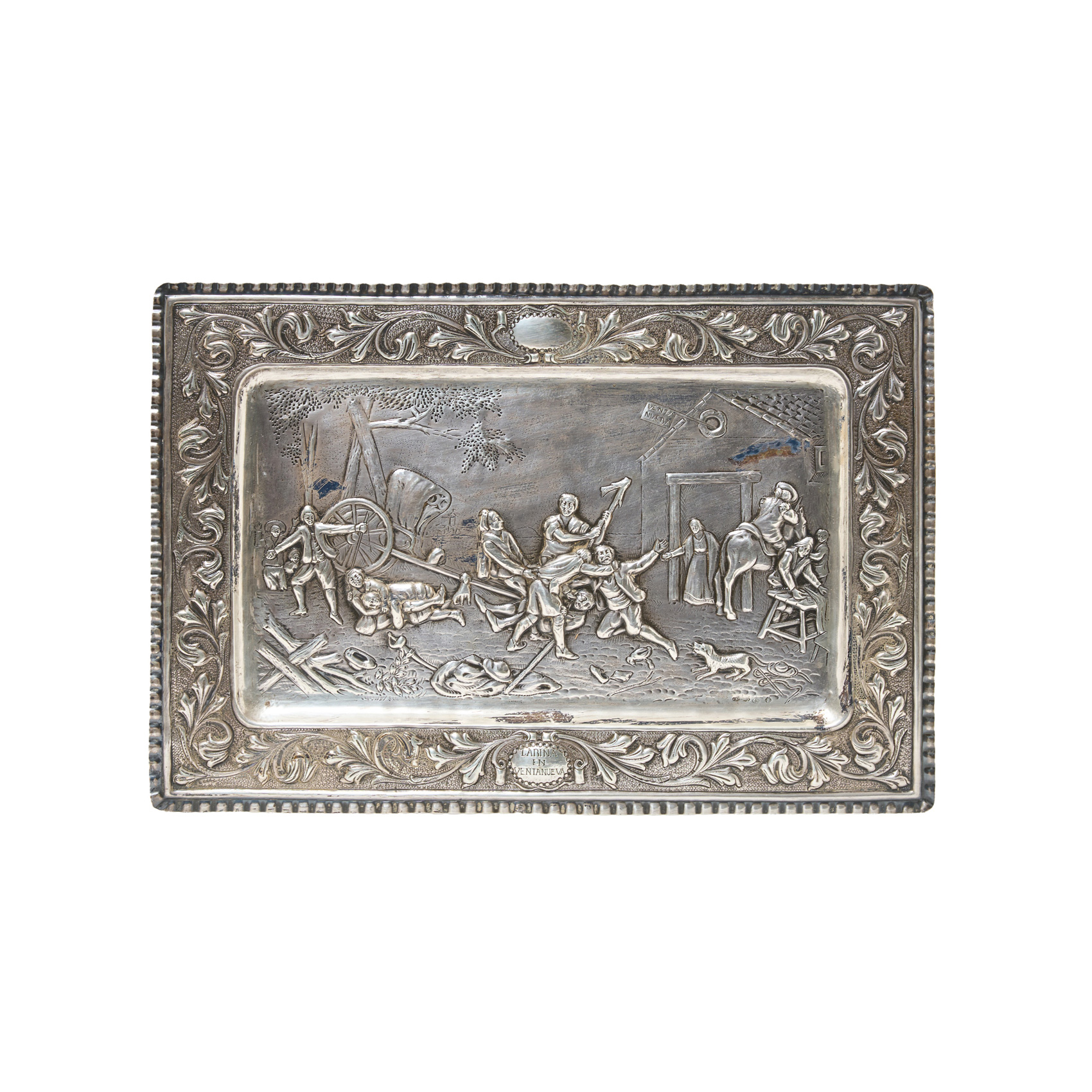 Bandeja en plata española punzonada y repujada con decoracion de roleos en perfil y escena de riña en el campo, s.XX.