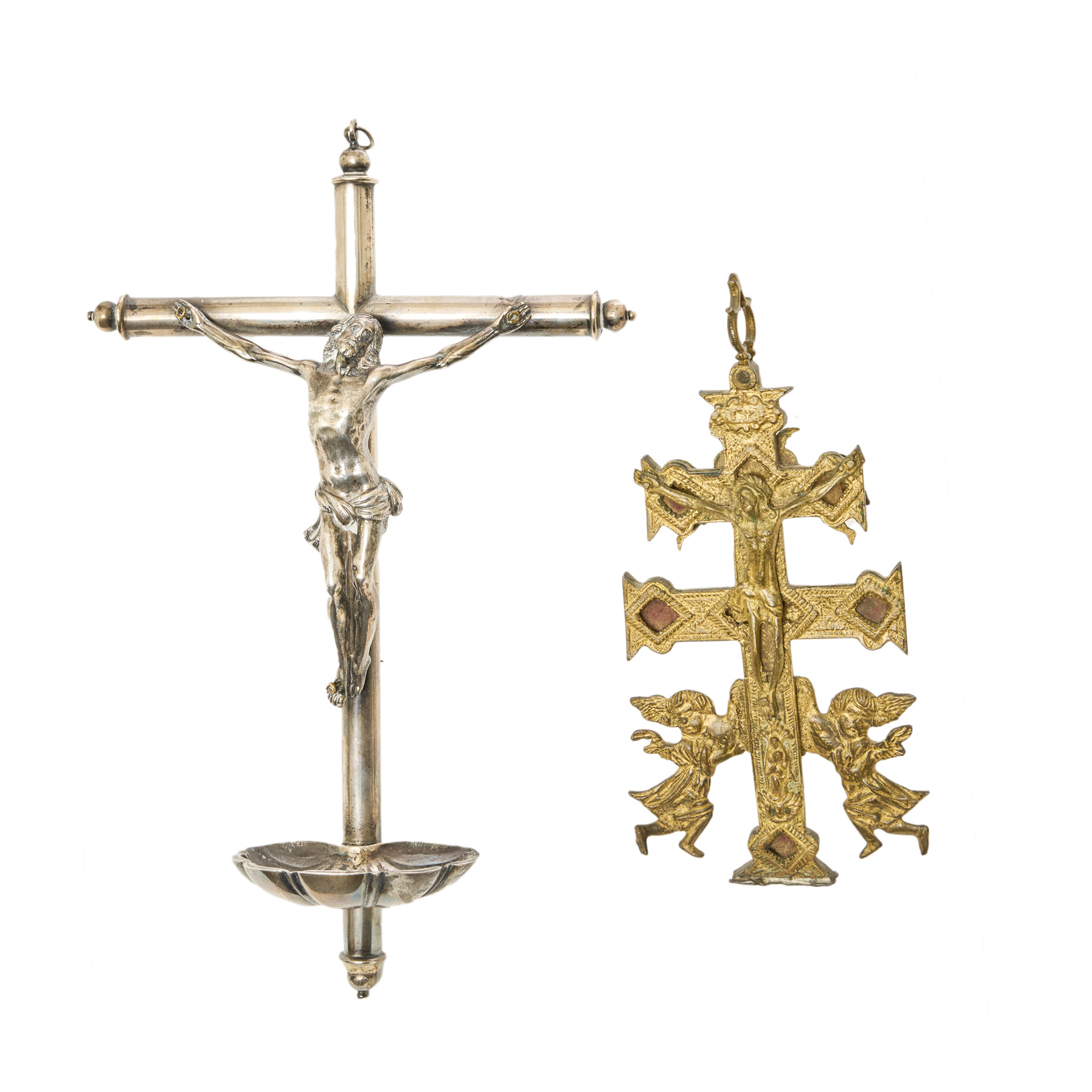 Lote compuesto por Cristo en plata con benditera y cruz de Caravaca en metal dorado, s.XX.