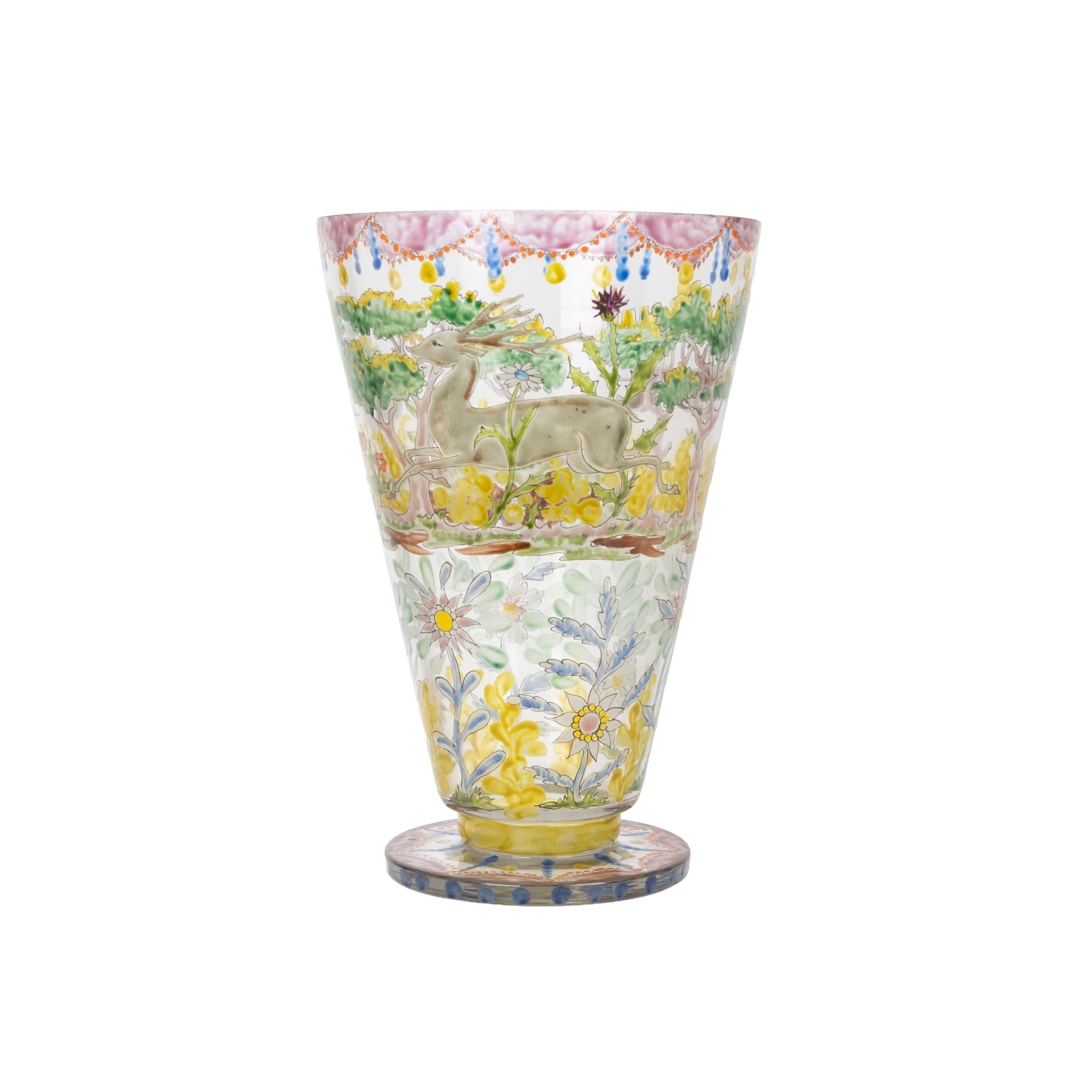 Jarrón en cristal de tonalidad translúcida esmaltado al fuego con decoraciones de motivos florales, paisajísticos y animalísticos. Firmado.