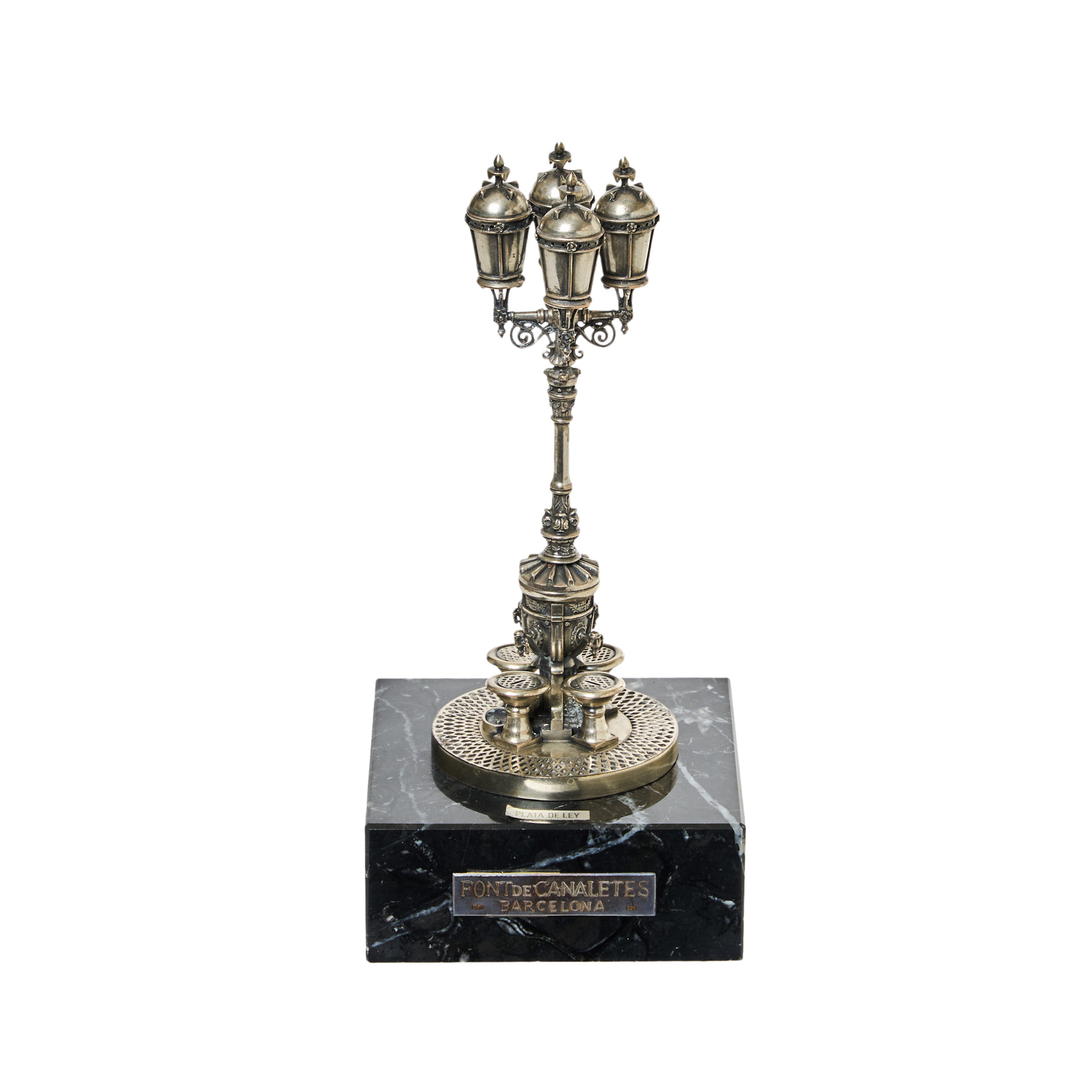 Fuente de Canaletas con placa en plata punzonada, s.XX. Apoya sobre peana en mármol negro veteado.