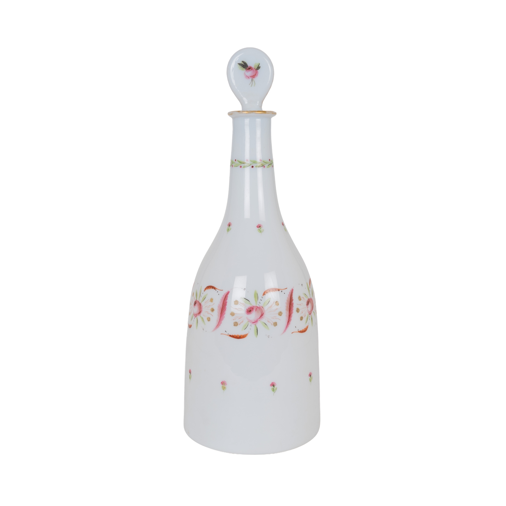 Botella en opalina con decoración esmaltada de rosas, motivos vegetales y delicados fileteados al oro fino, fles. del s.XIX-ppios. del s.XX.