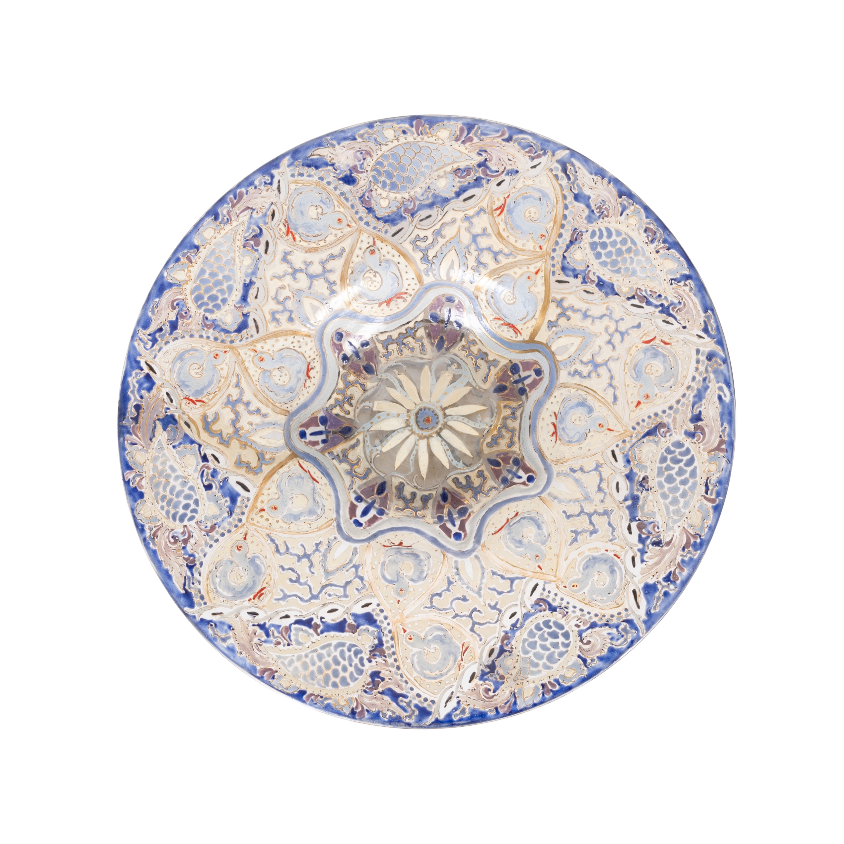 Plato en cristal de tonalidad translúcida con decoración de motivos florales y formas zoomorfas esmaltadas al fuego.