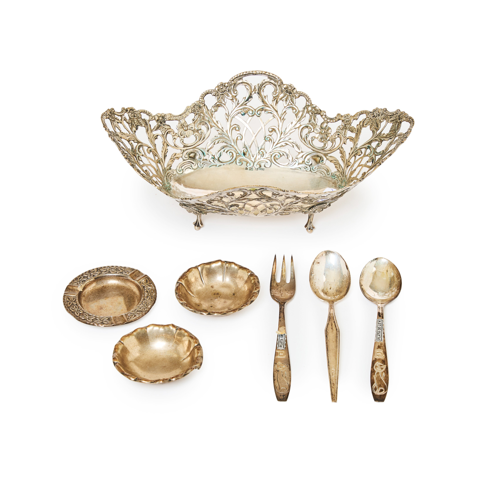 Lote de siete piezas variadas en plata española punzonada, s.XX. Compuesto por dos cucharitas, un tenedor, tres platitos y un centro calado.