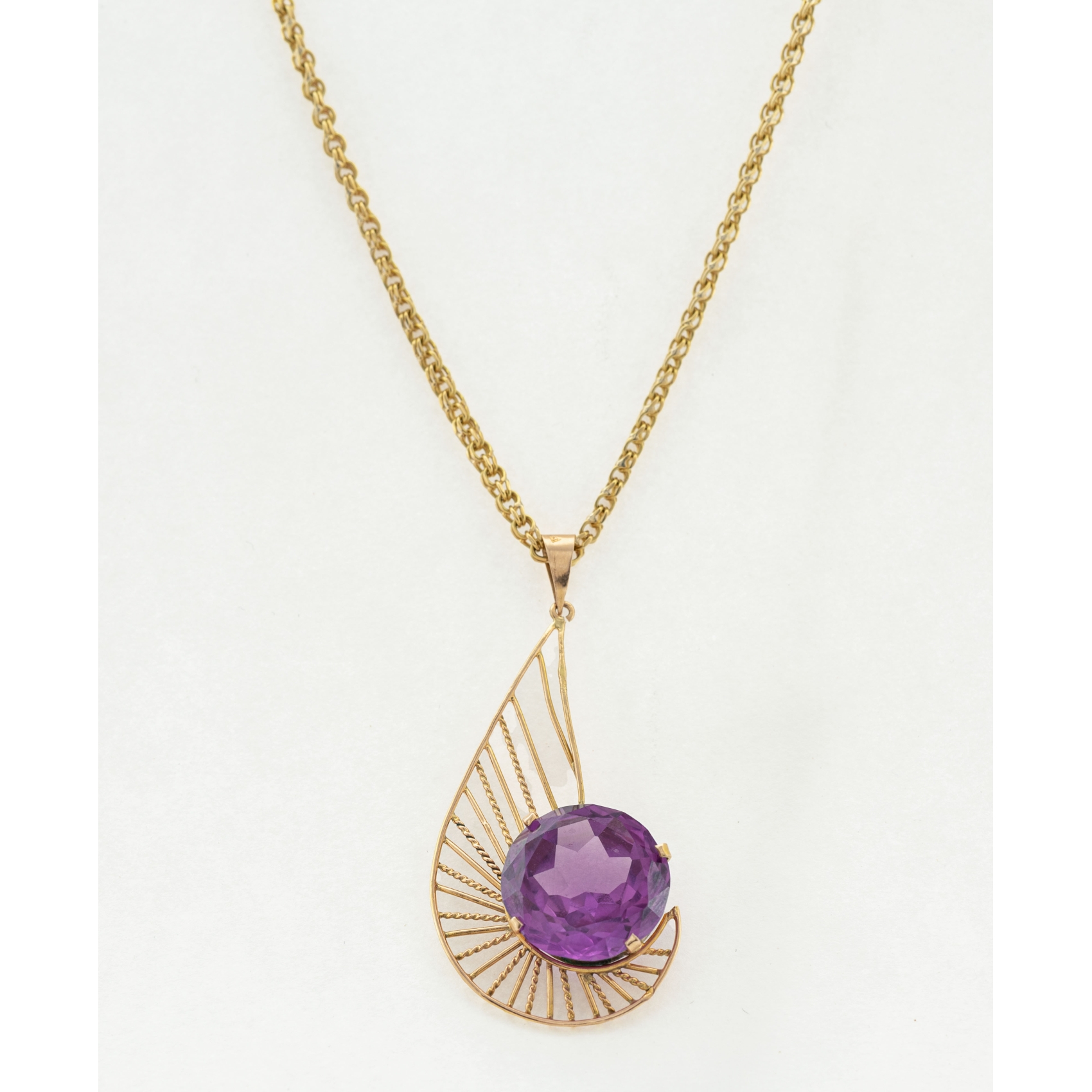 Cadena milanesa y colgante calado 5,8 x 2,5 cm. en oro con amatista talla redonda de 17 mm. engastada en garras.