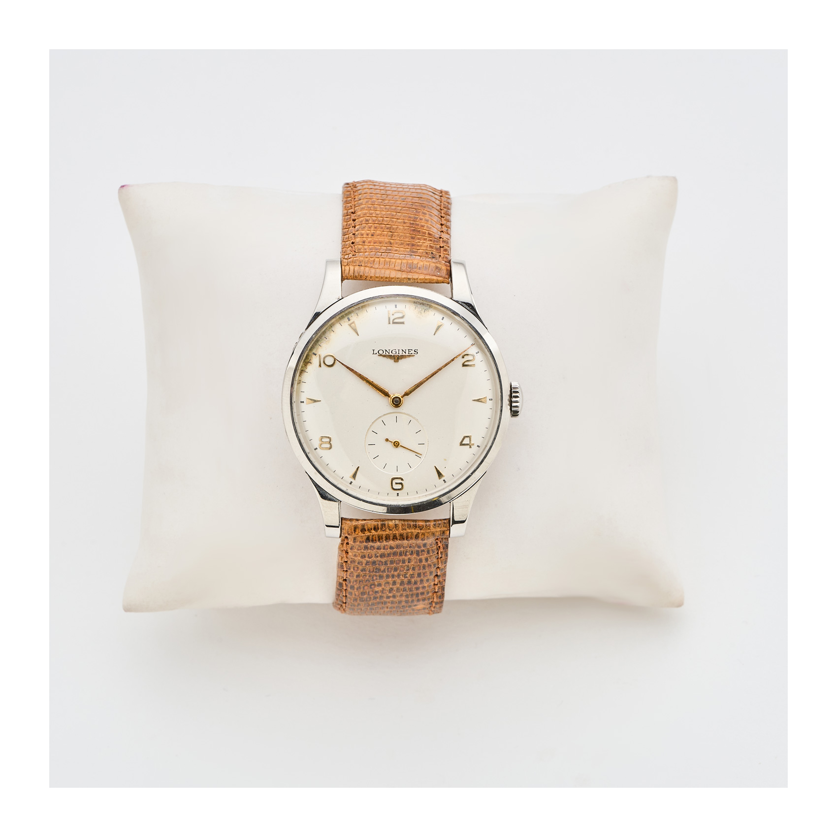 LONGINES. Reloj vintage de pulsera para caballero. En acero. Esfera blanca con numeración arábiga y a trazos aplicados. Segundero a las 6. Mecanismo automático.