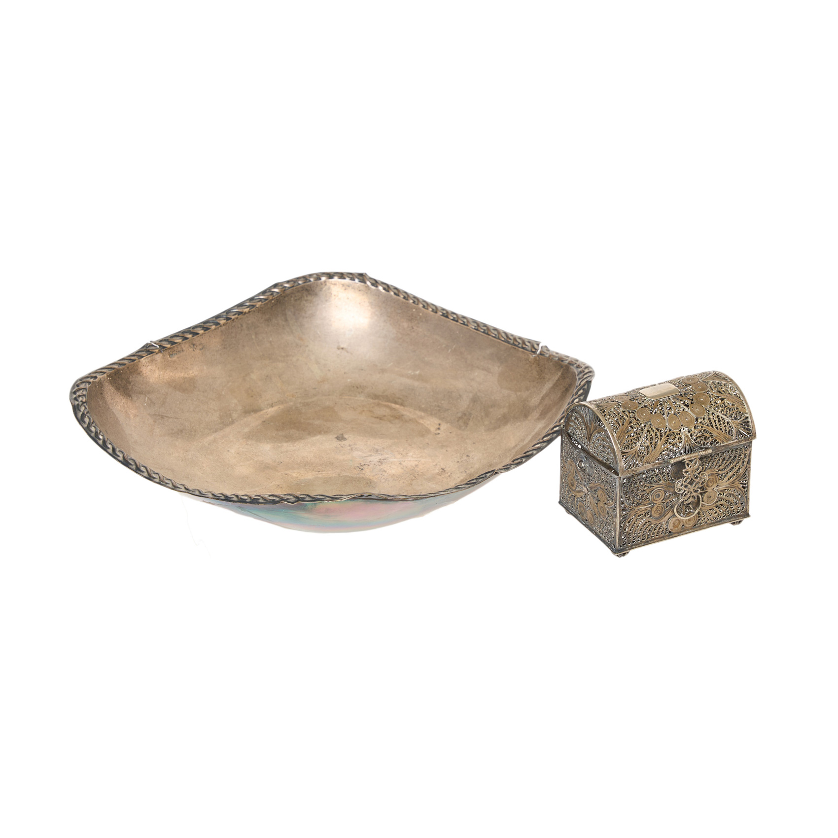 Pequeño arcón y centro en plata española punzonada con decoraciones de roleos y de cordón perimetral, s.XX.