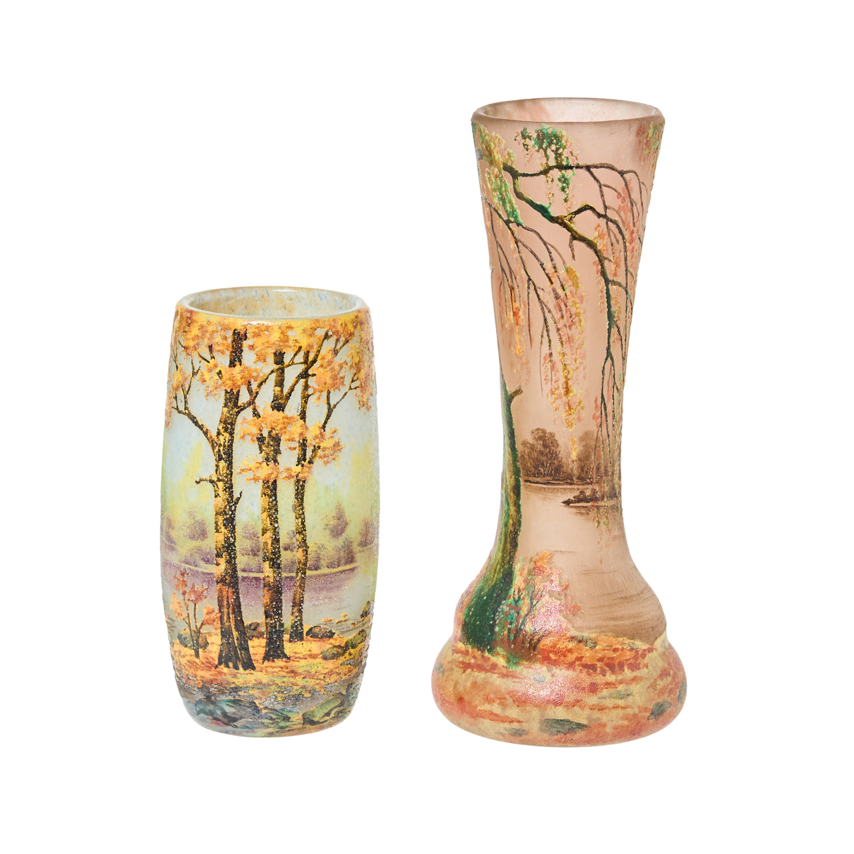 Pareja de jarrones en «patê de verre» con decoración esmaltada de paisajes, s.XX. Uno de ellos con marca en la base de la manufactura Daum (Nancy, Francia) y otro firmado Richard.