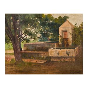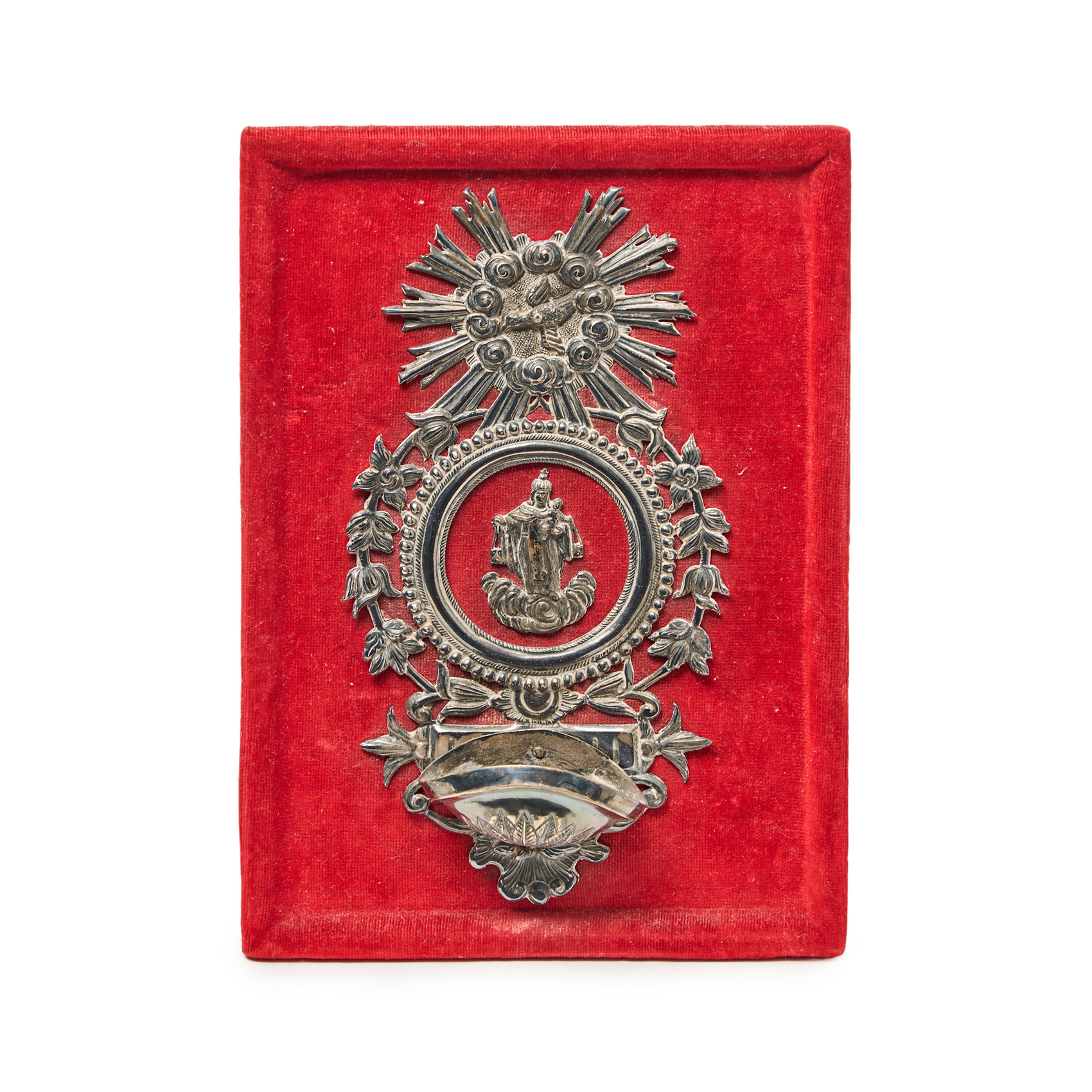 Benditera en plata con representación de la Virgen y el Niño sobre plafón tapizado en terciopelo rojo, c.1900.