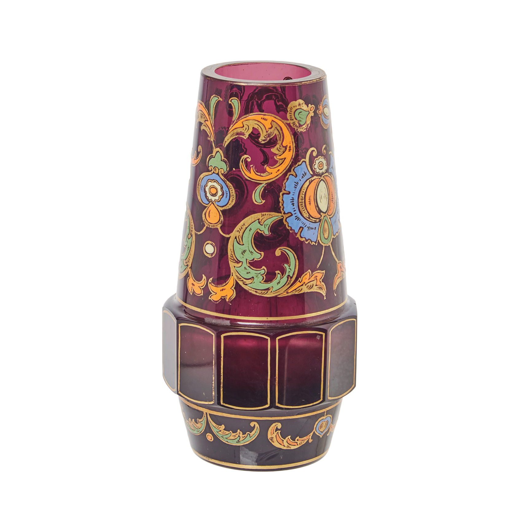 Jarrón en cristal de Bohemia de tonalidad violeta parcialmente facetado con decoraciones fitomorfas y fileteados al oro fino, ppios. del s.XX.