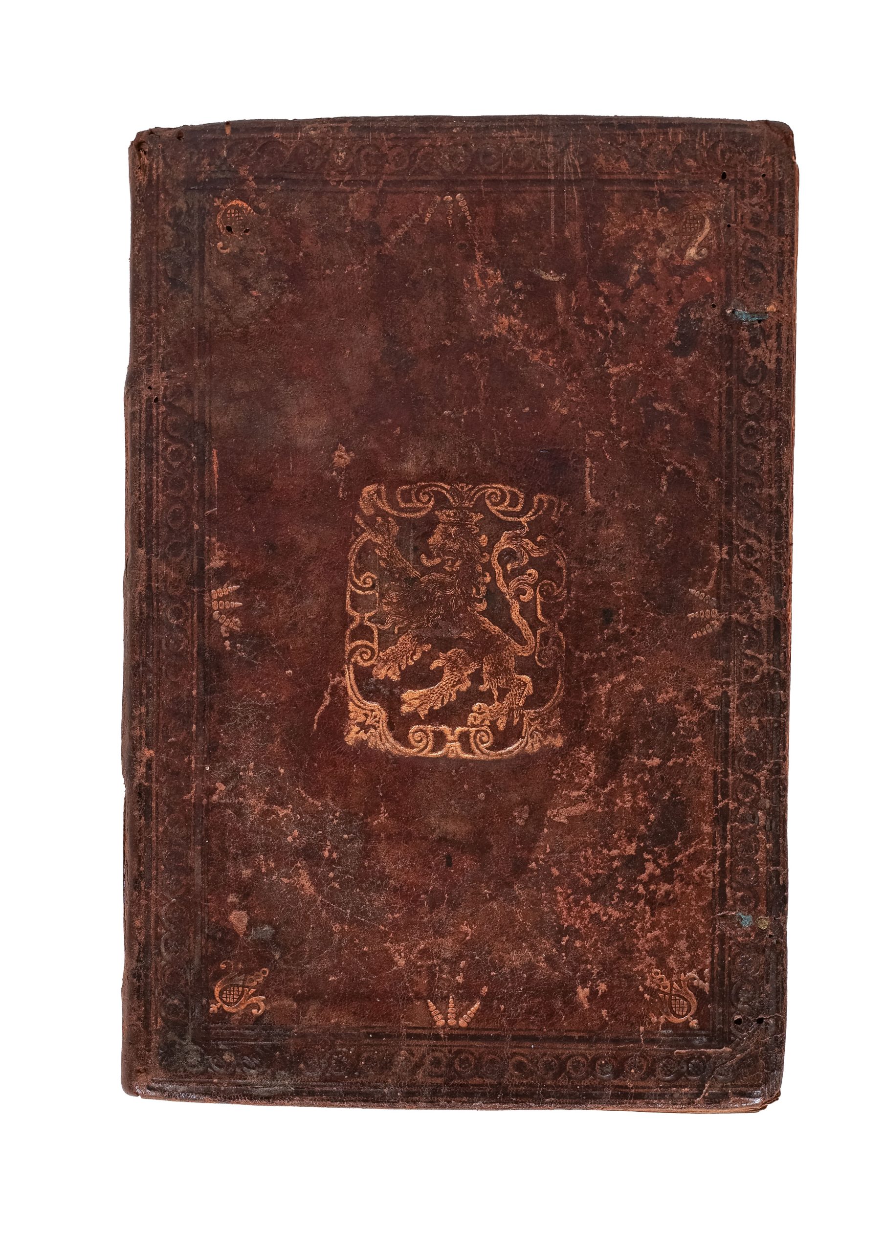 Ordenanza rubricada sobre papel, con grabados de Cristo en la Cruz y la Virgen con el Niño. Encuadernado en piel con escudo heráldico grabado en dorado.