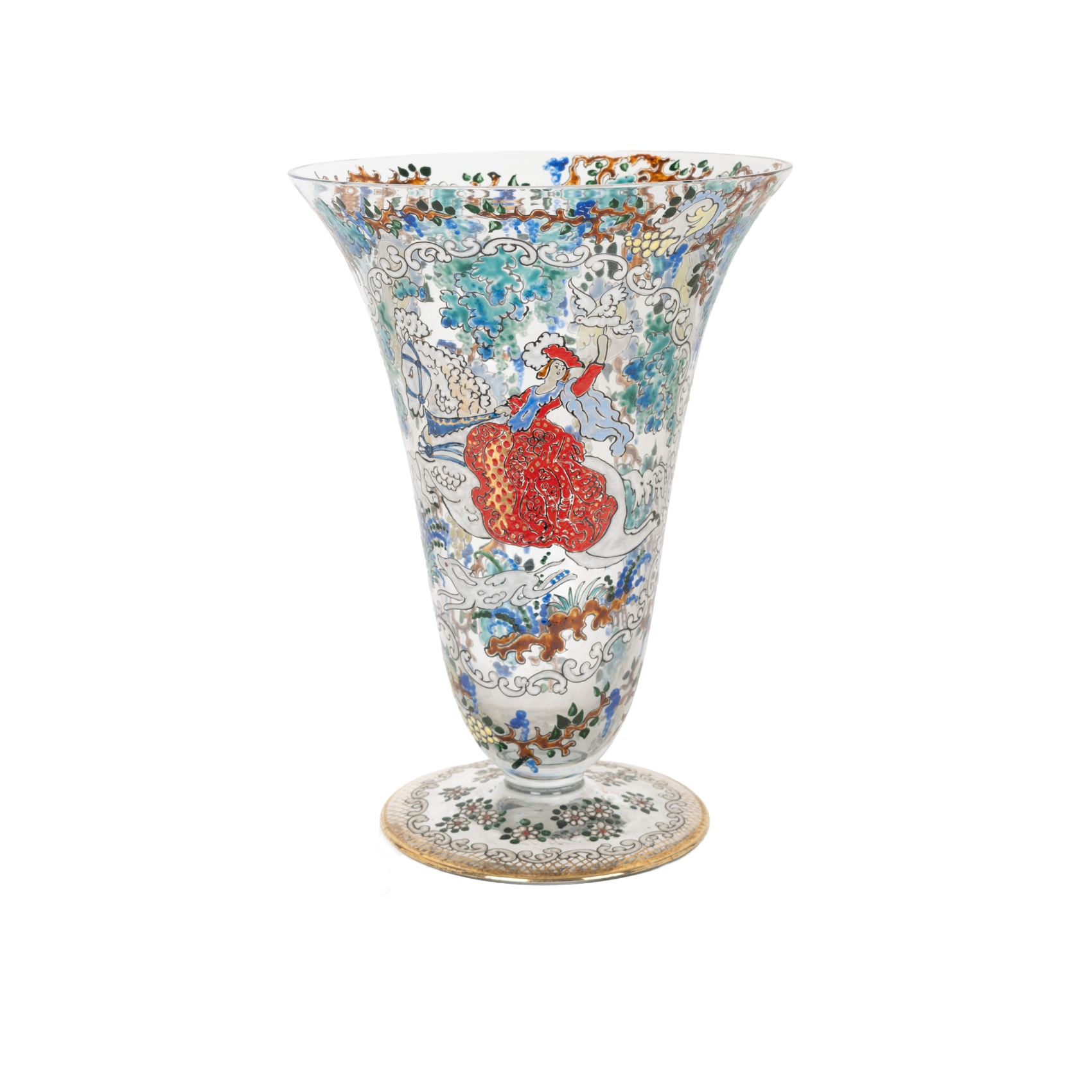 Jarrón en cristal de tonalidad translúcida esmaltado al fuego con decoración de motivos vegetales, dama a caballo y ribeteados al oro fino. Firmado.